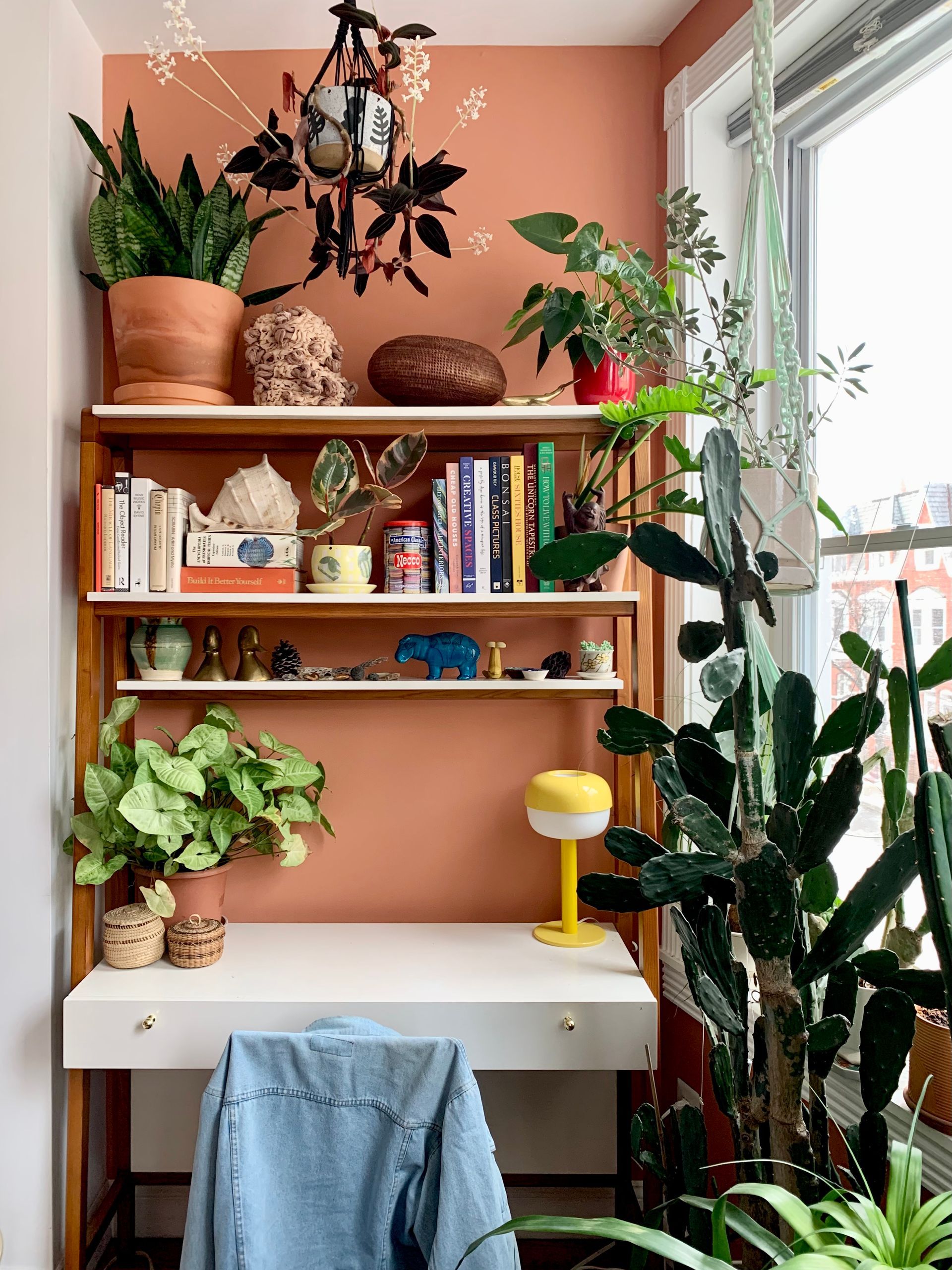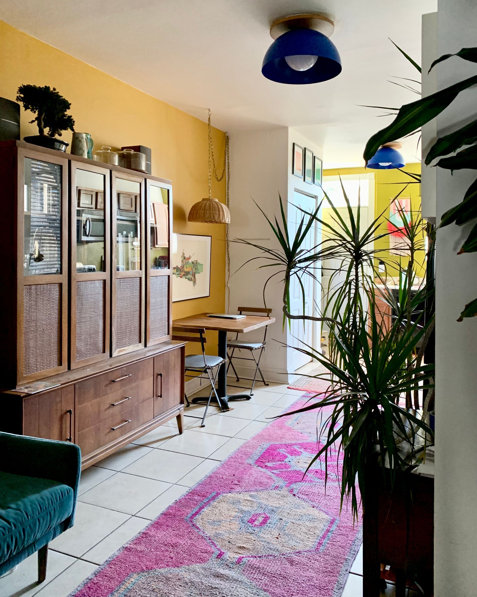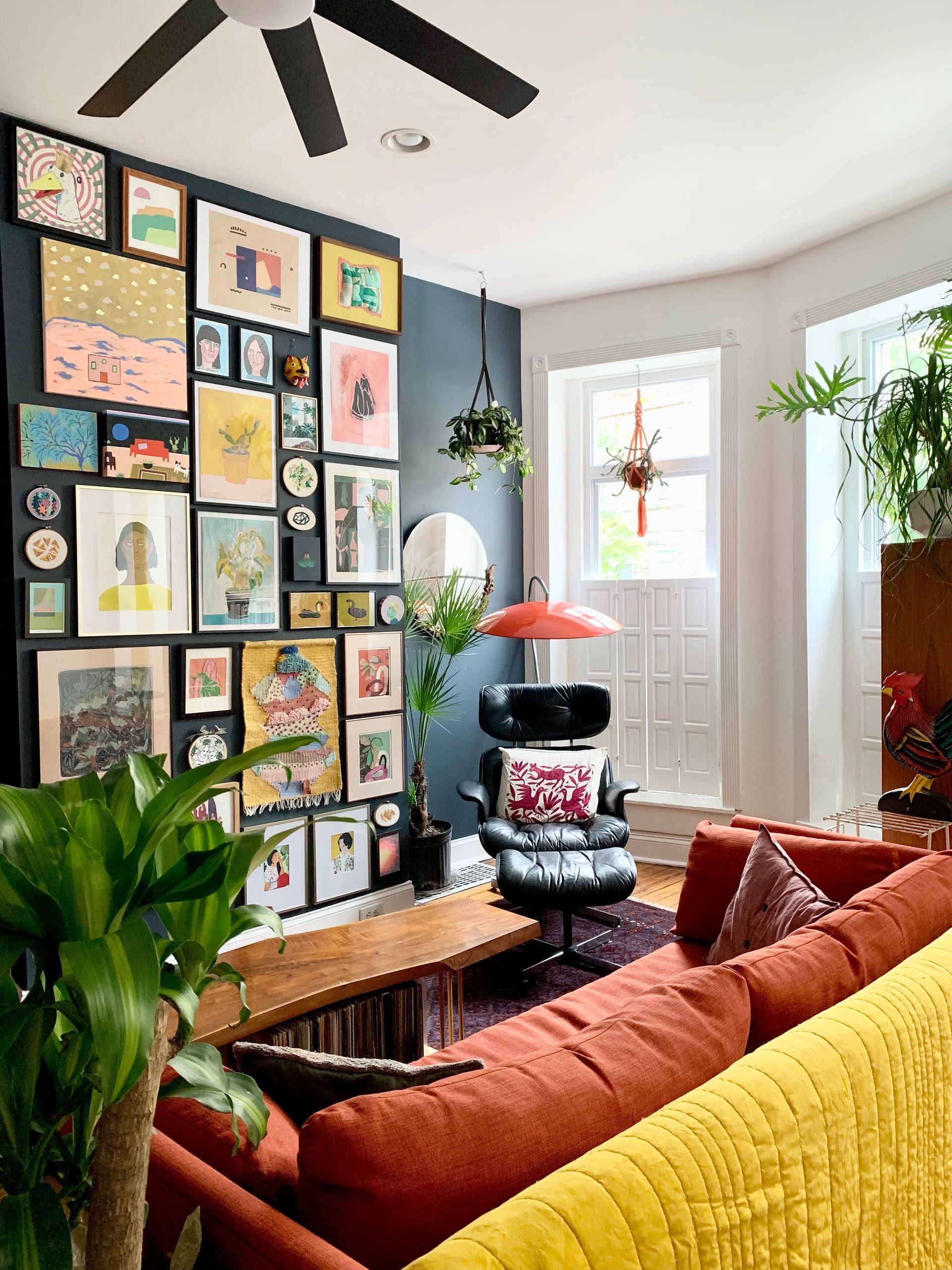 instagram and getting glimpses inside her home, I quickly saw where her inspiration comes from. Sarah's home is as warm and meticulously curated as the scenes she stitches. The gallery walls feel like collections of memories pieced together; I can hear the plants gently rustling from an open window; the warm colors create a sense of calm and peace.