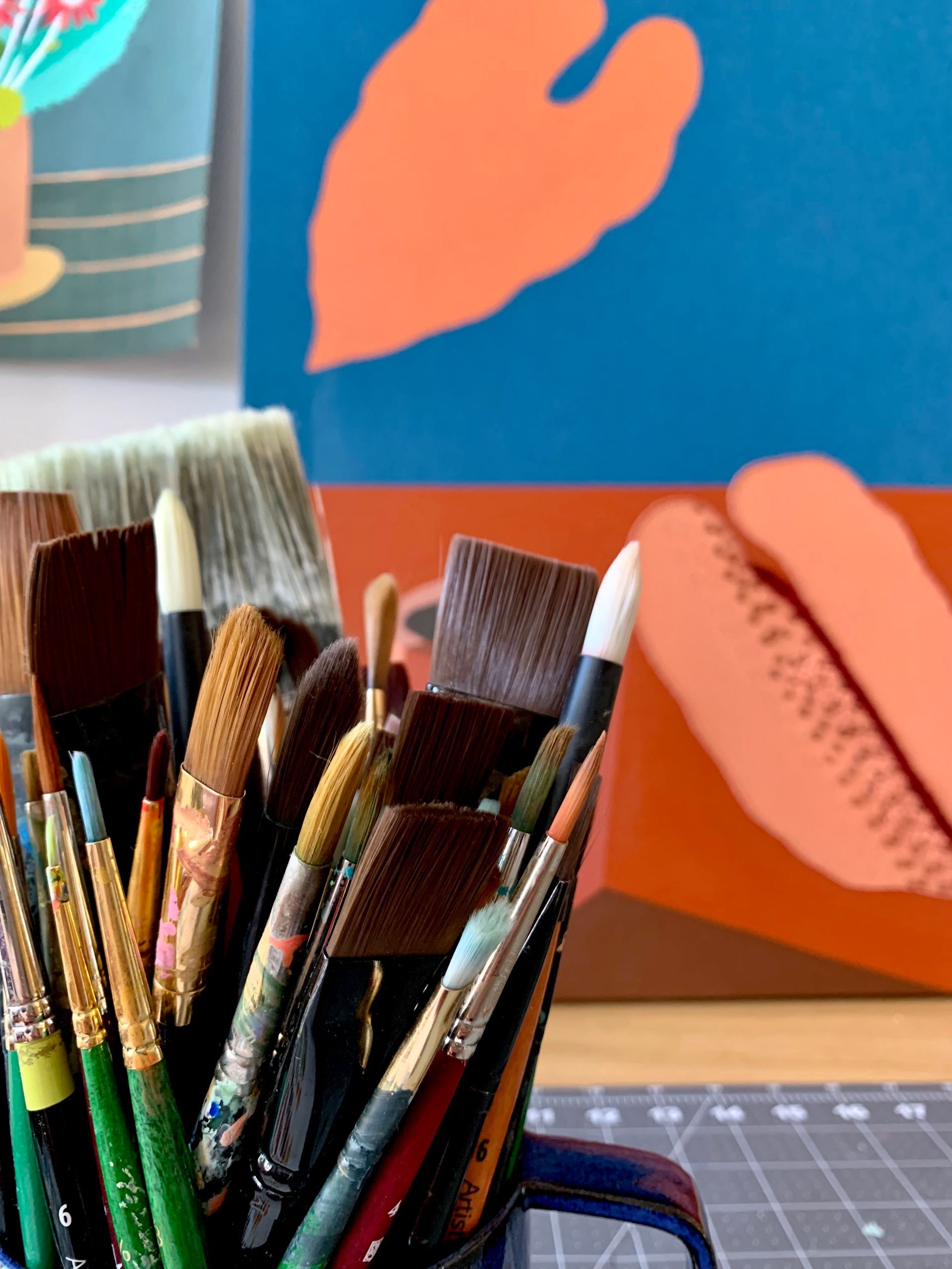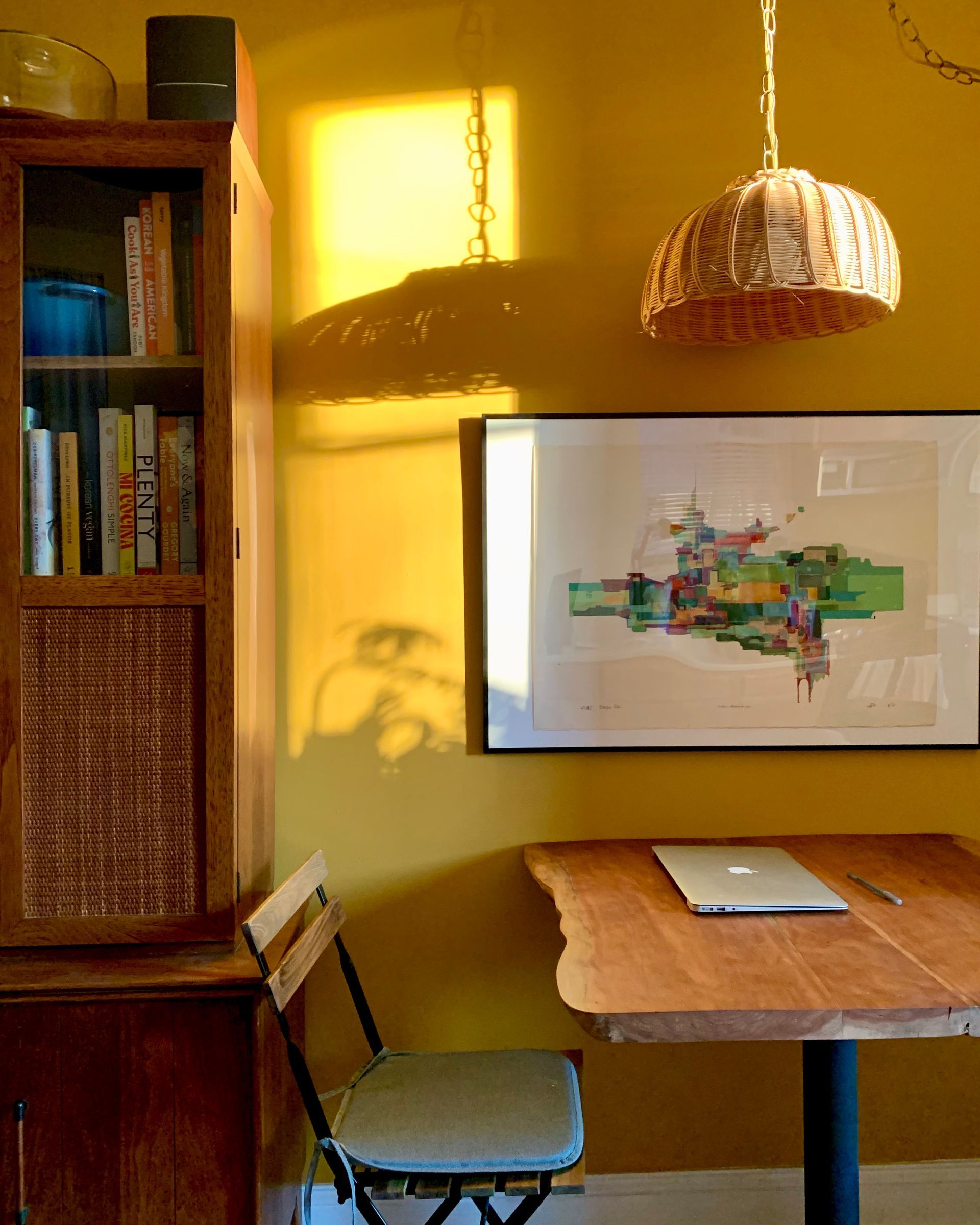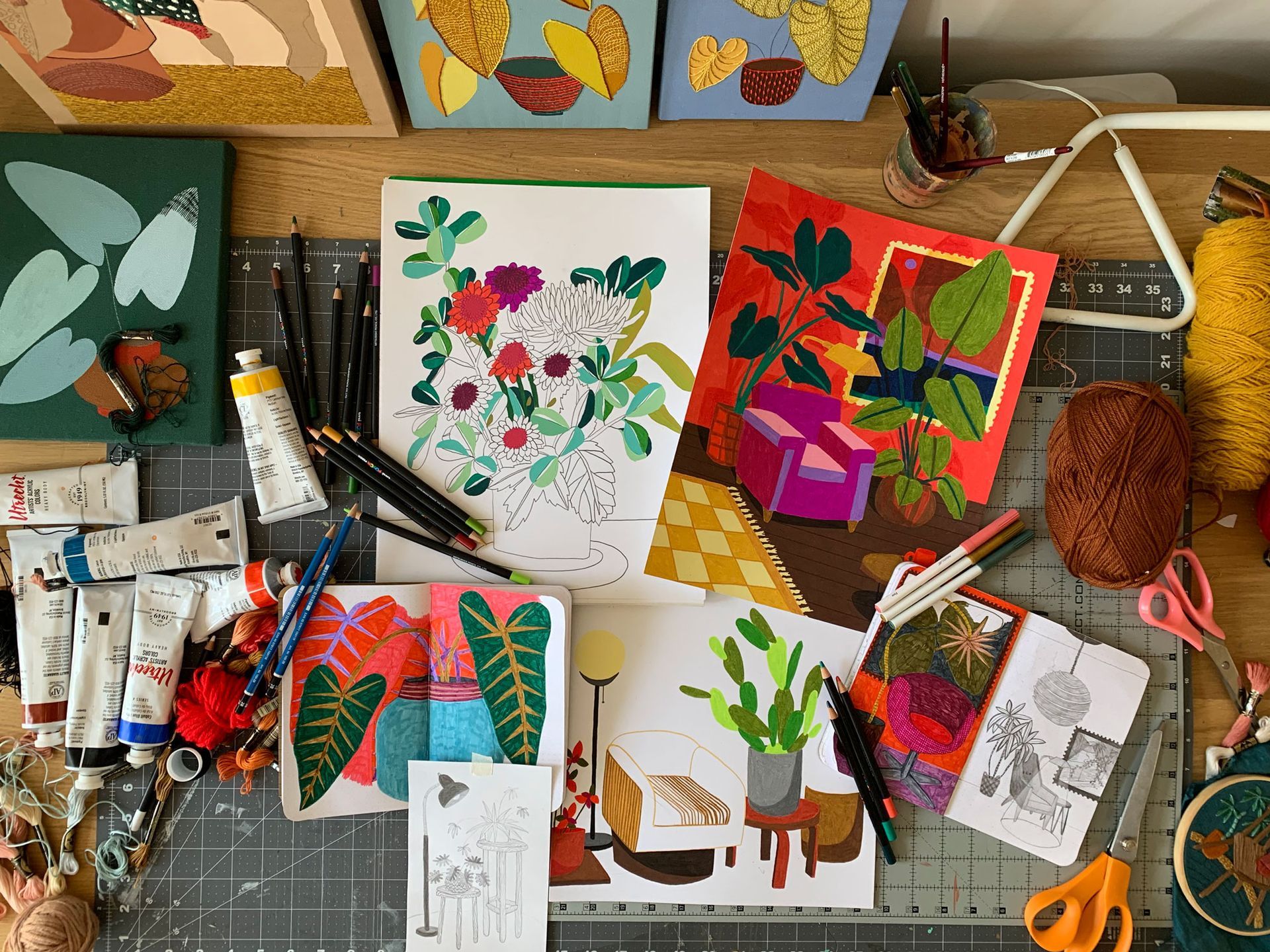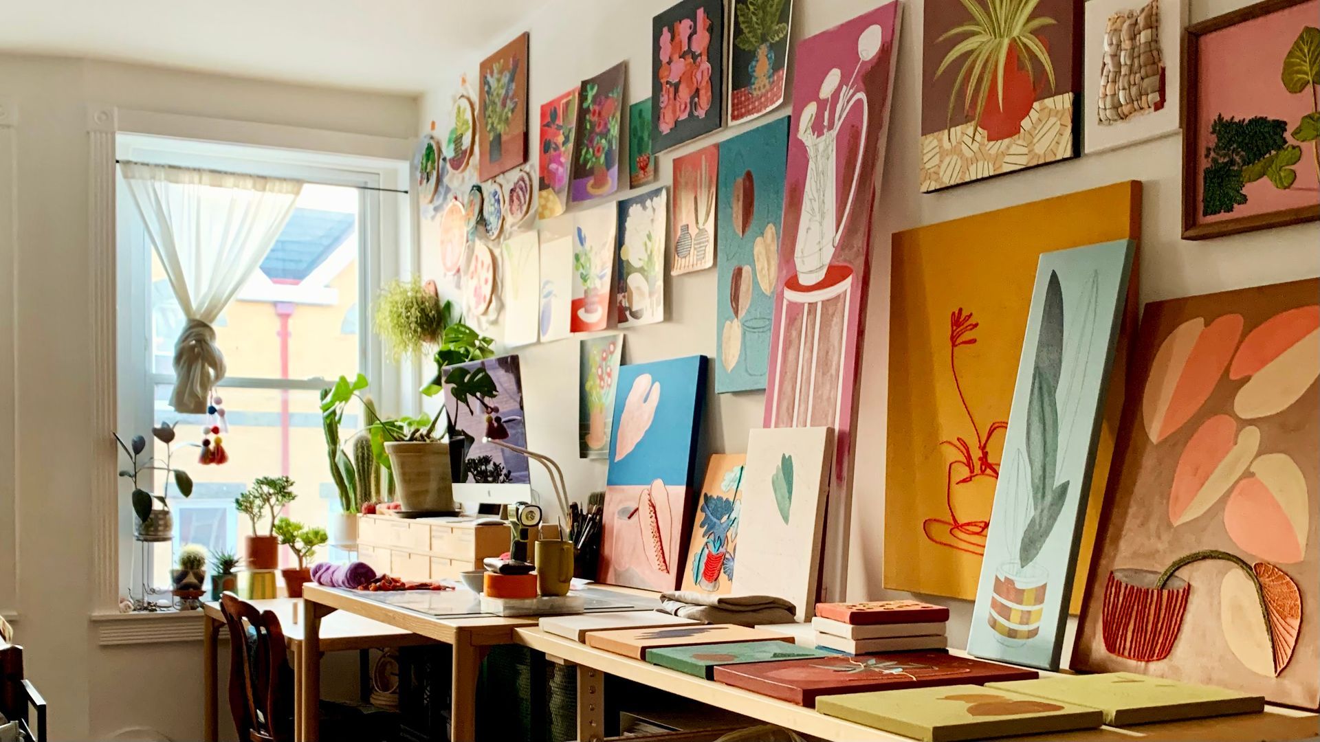 "My home decor style and preferences have been influenced by the imaginary interiors I spent years stitching, and my real physical space, in turn, influences current and future works. I create art that is inspired by Home, both in actual depictions of domestic spaces and objects, and in the concepts of safety and comfort. I want to create work that people want to live with. Work that brings a dose of joy each time it’s looked at. I want to infuse my own home and studio with these feelings too."