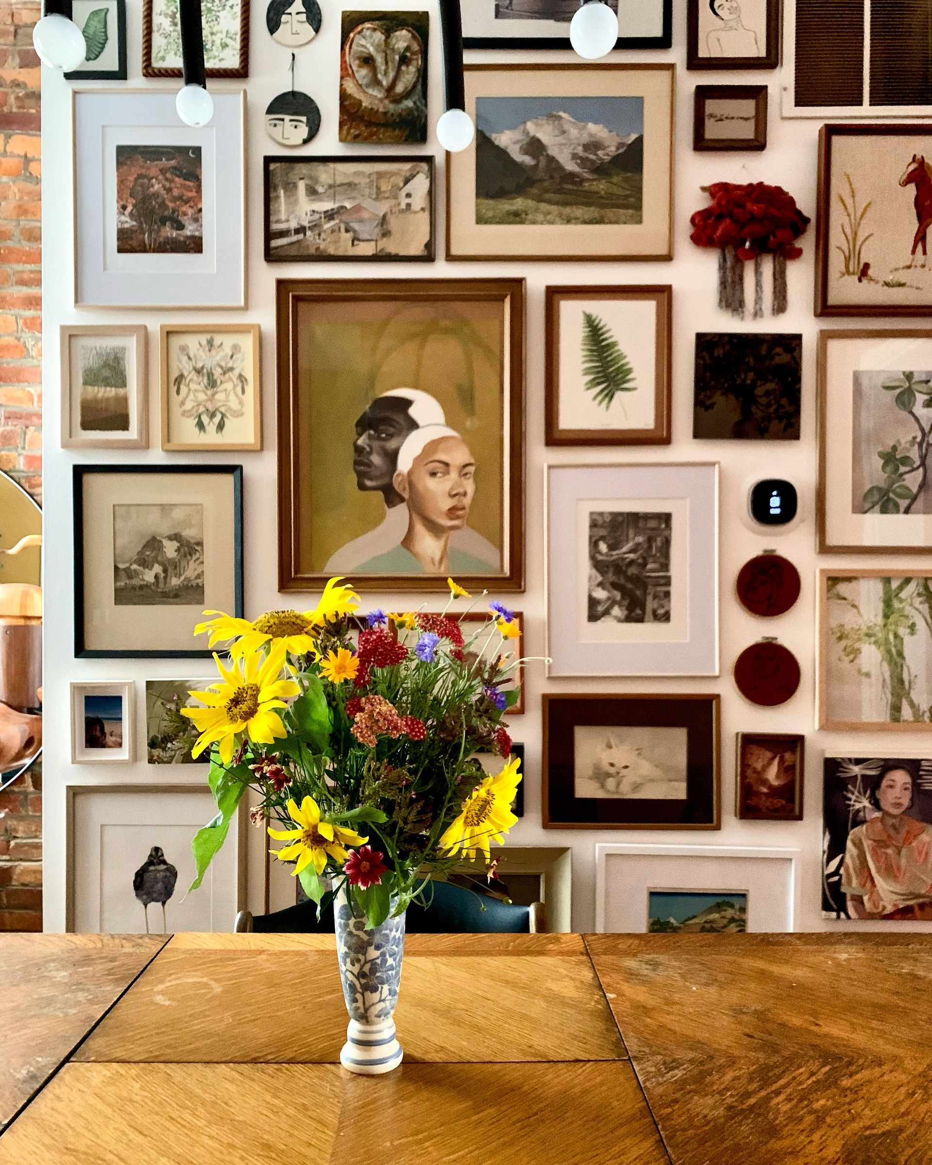 instagram and getting glimpses inside her home, I quickly saw where her inspiration comes from. Sarah's home is as warm and meticulously curated as the scenes she stitches. The gallery walls feel like collections of memories pieced together; I can hear the plants gently rustling from an open window; the warm colors create a sense of calm and peace.